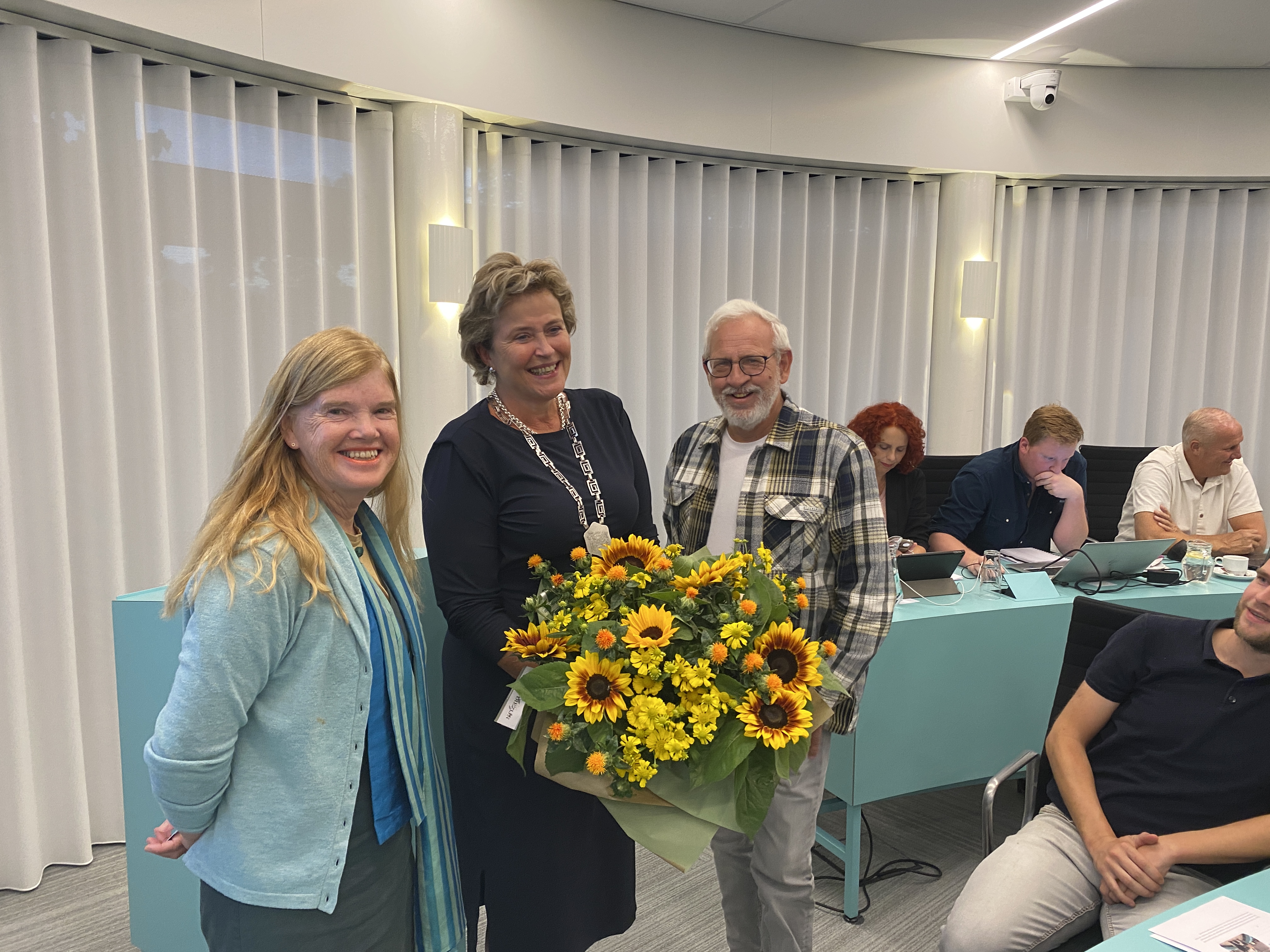 V. van Vuuren en H. Kröger bieden bloemen aan namens de gemeenteraad.